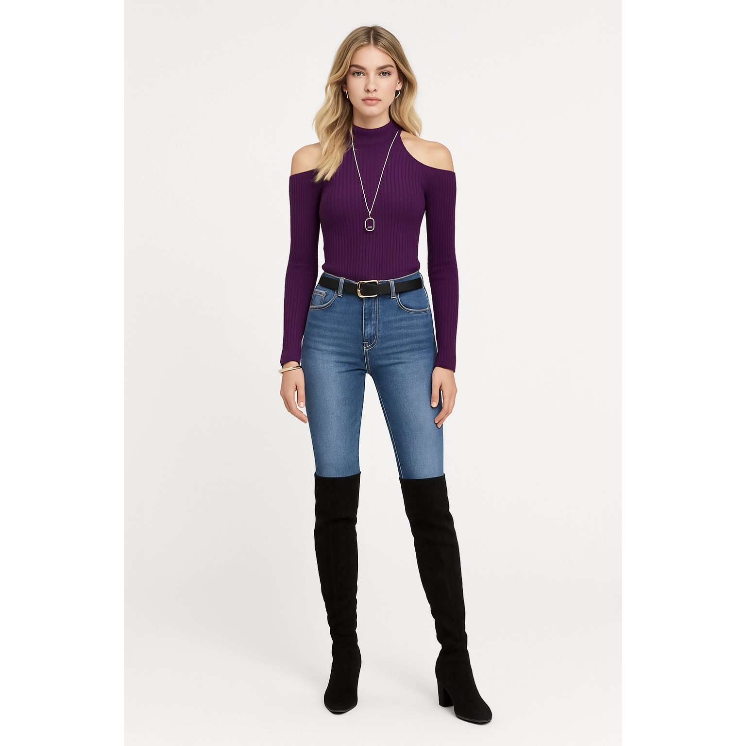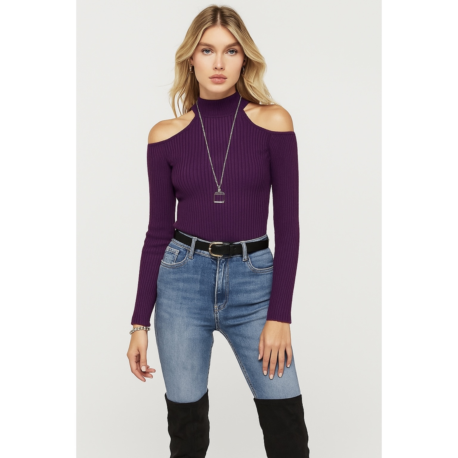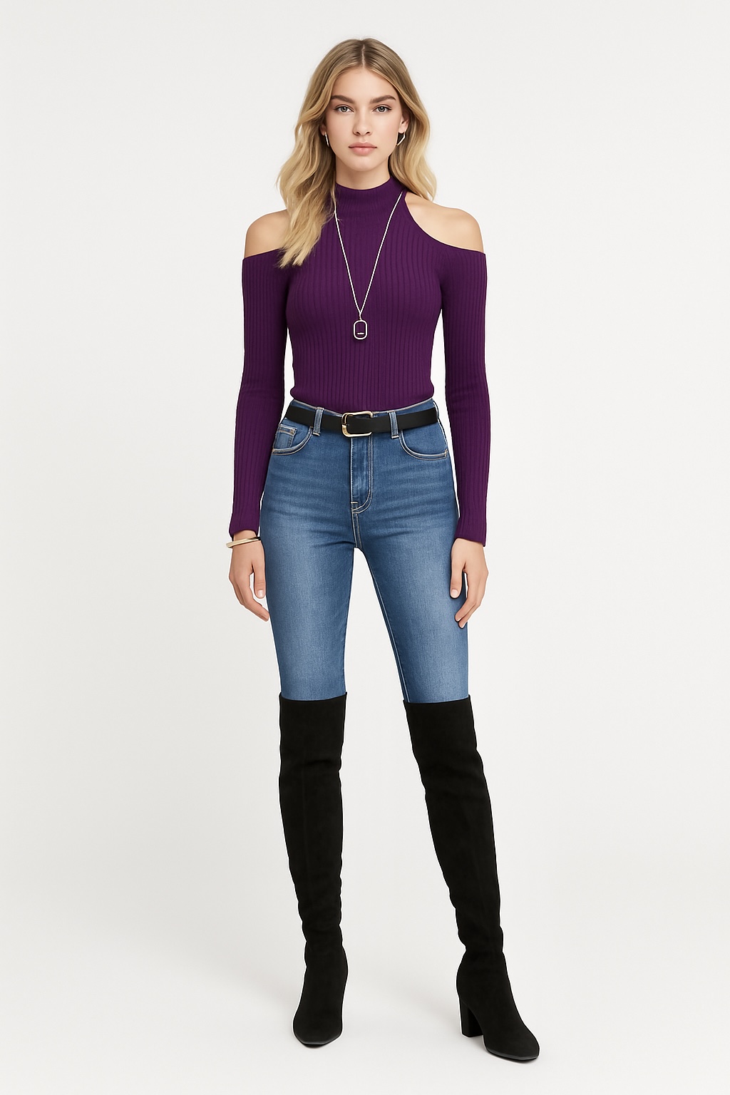 Drenched in a rich jewel tone, the Amethyst Allure Sweater brings effortless glamour to winter chic. Its sleek mock neck and shoulder cutouts add a touch of bold femininity, while the ribbed knit contours beautifully to the body — perfect for pairing with high-rise jeans or statement boots. A piece that blends elegance with confidence, making it a signature Aura by Aashi staple.