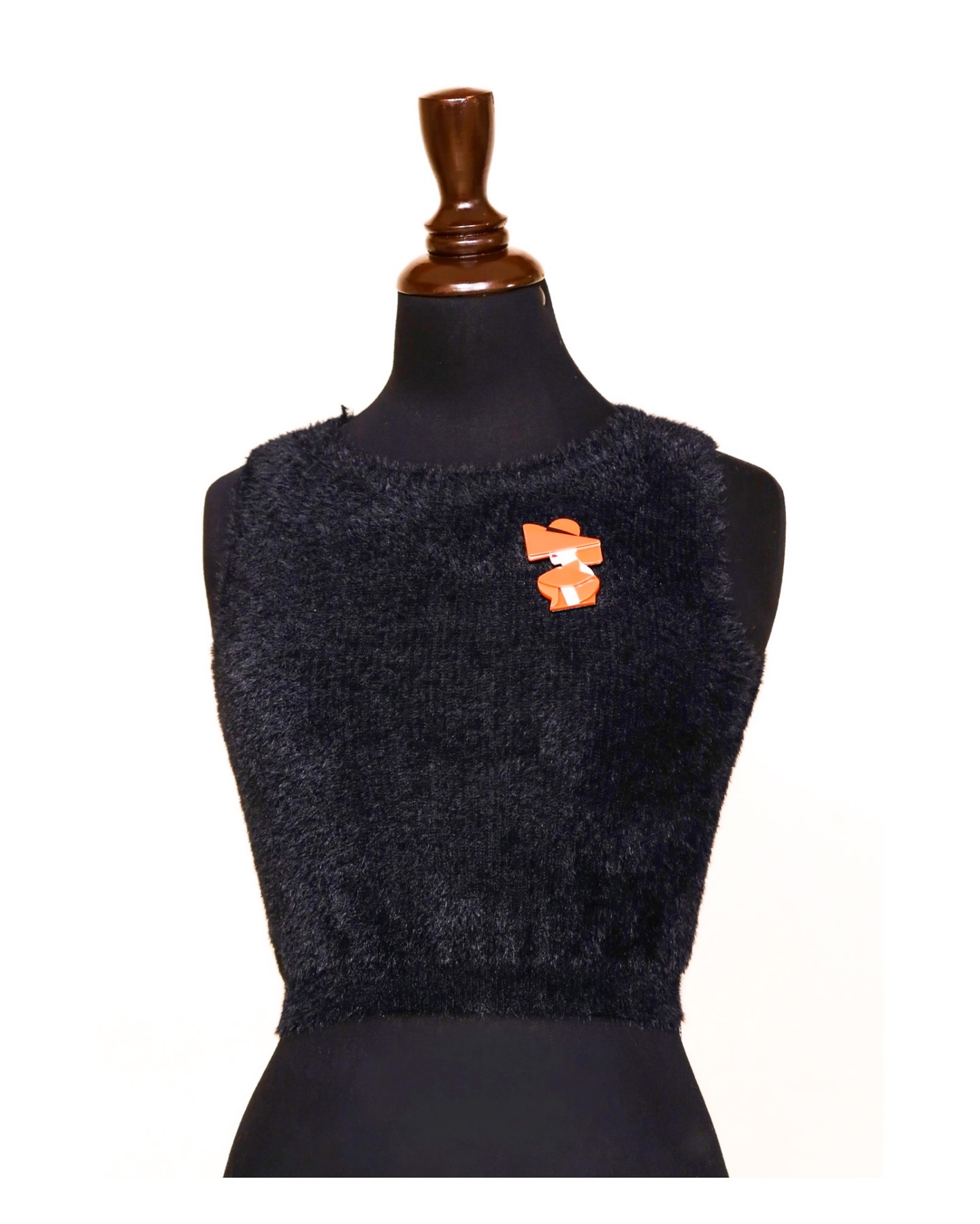 “Sleeveless Faux mink sweater with a charming broach , adding glamour to it.”