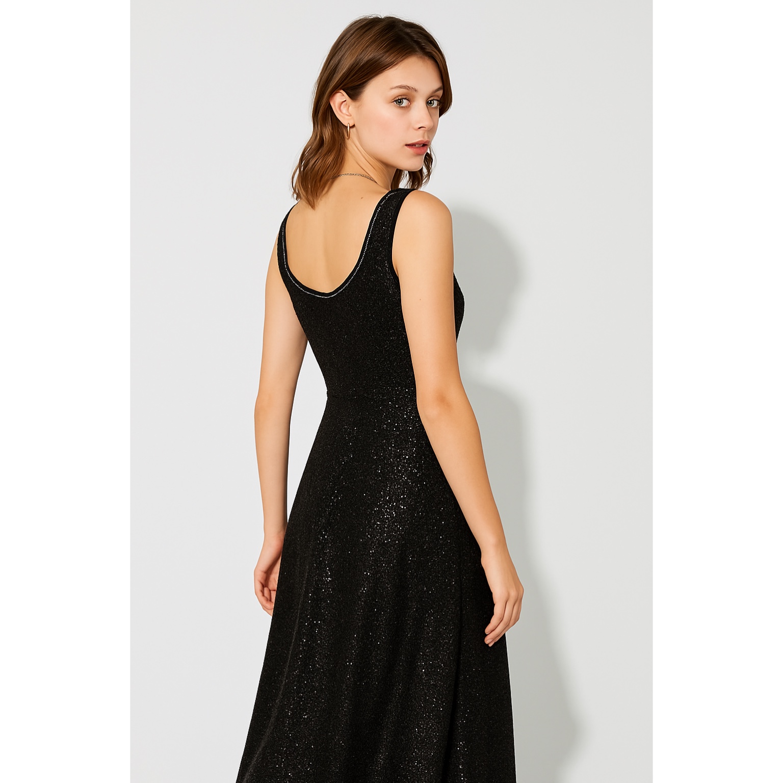 A small black sequin midi dress would be a fitted or slightly structured garment designed for individuals who wear smaller sizes. This version of the dress still incorporates all the glamorous elements