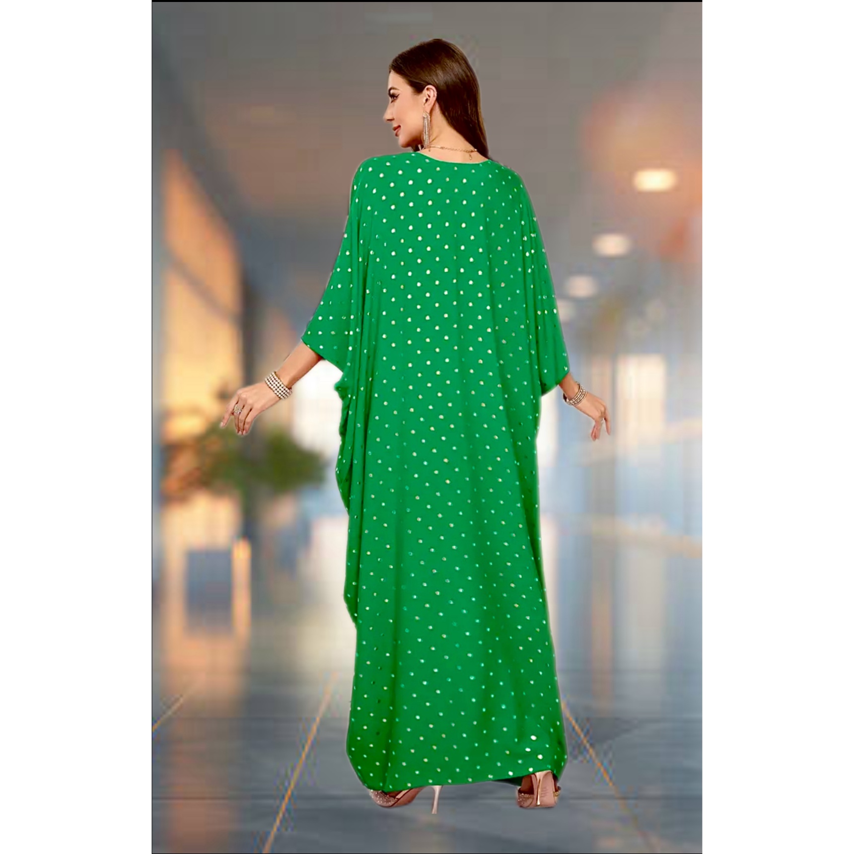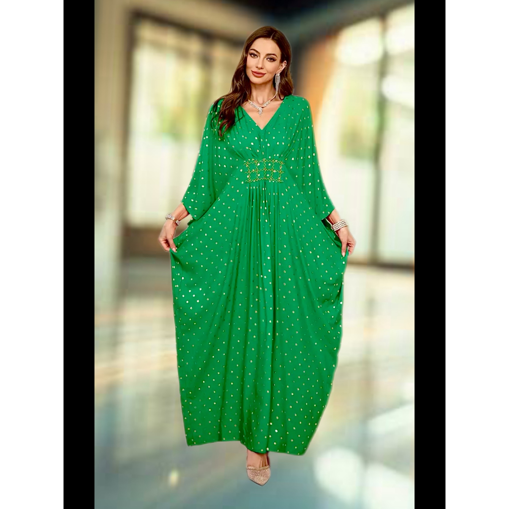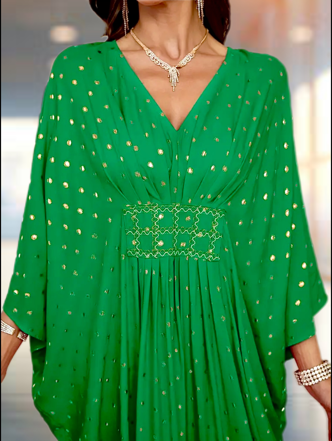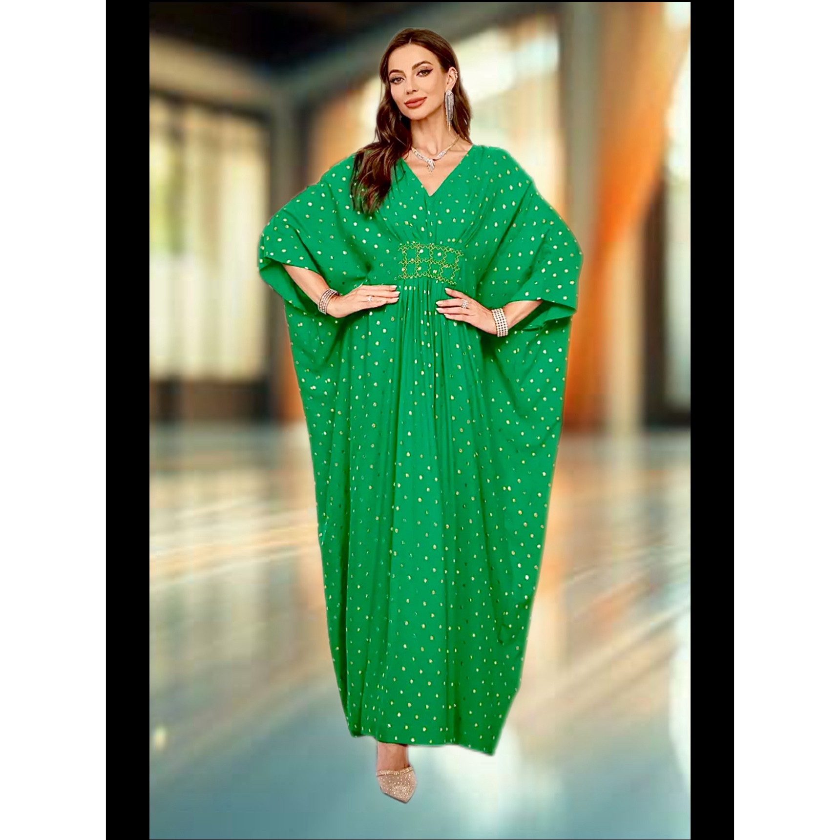 Emerald Elan Kaftan — an emerald, free-flowing drape scattered with molten-gold dots and a hand-detailed, waist-defining panel.