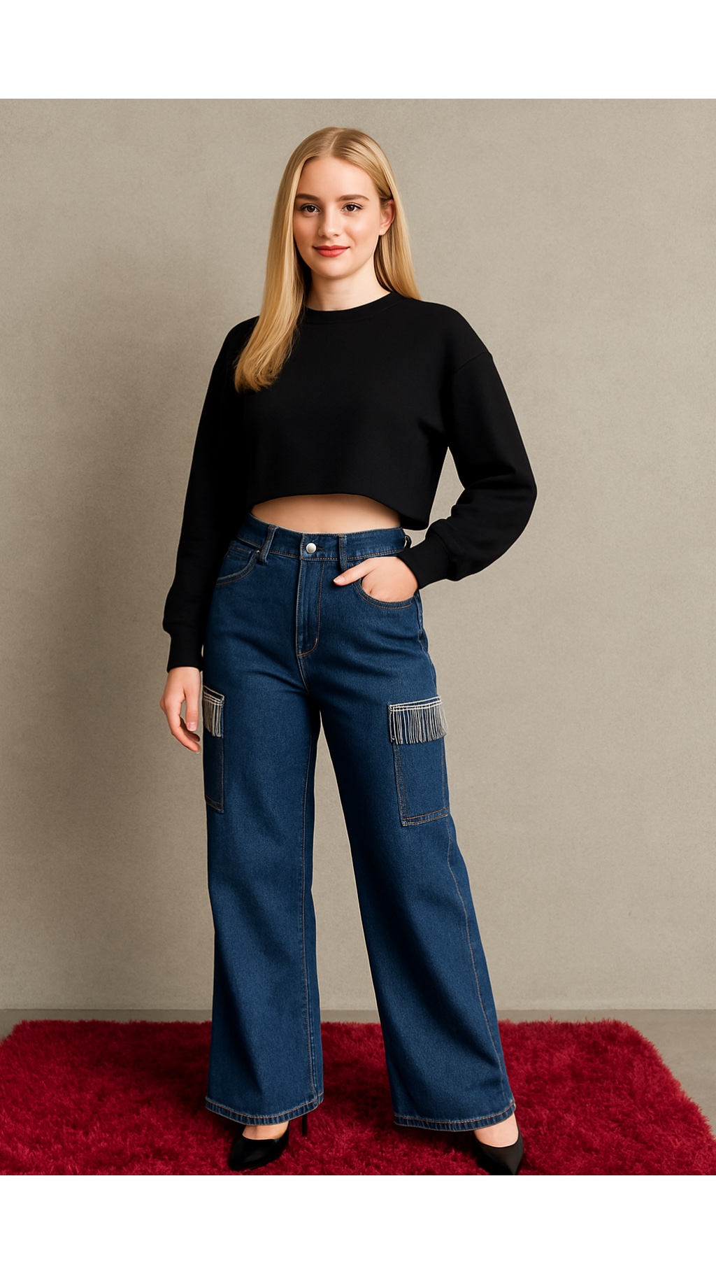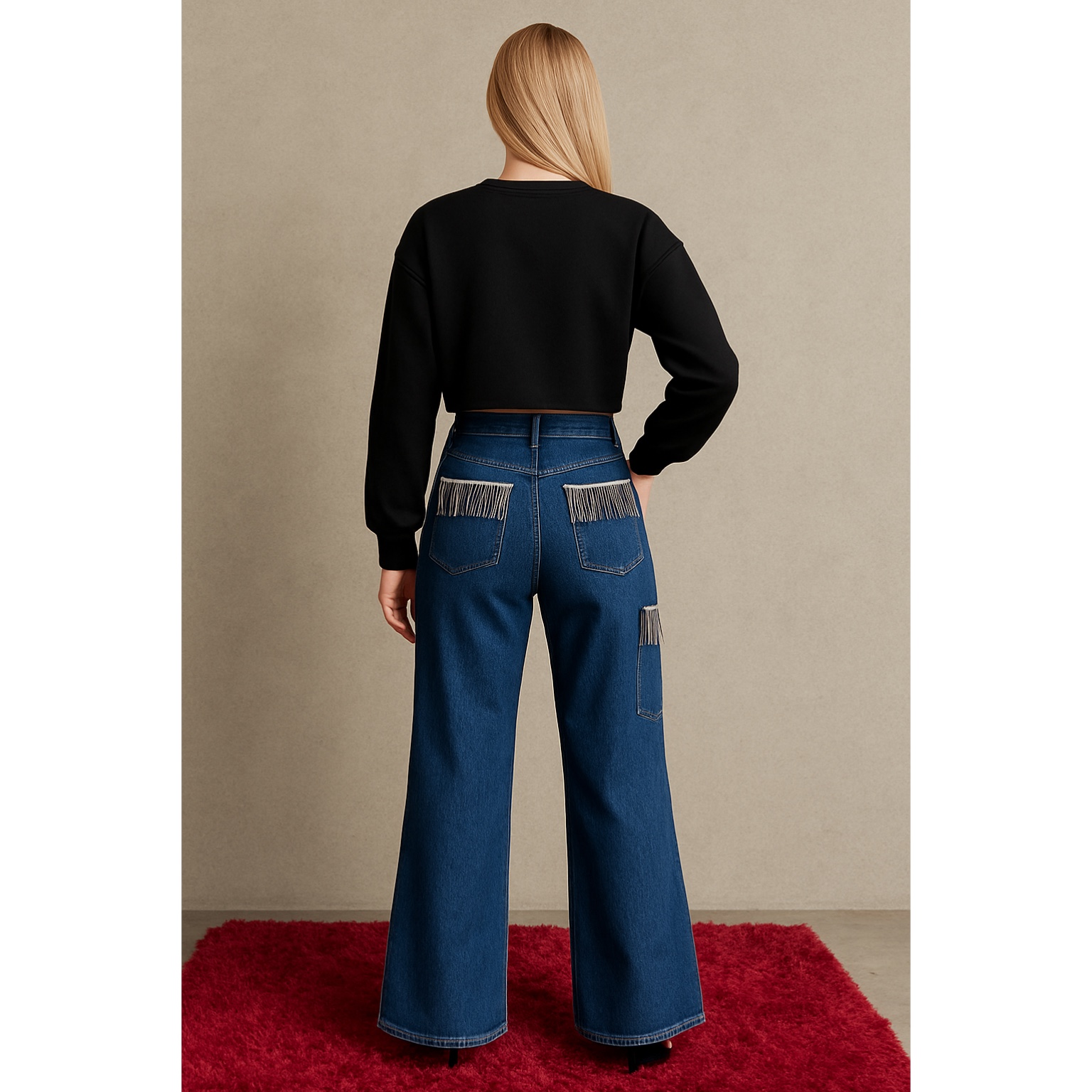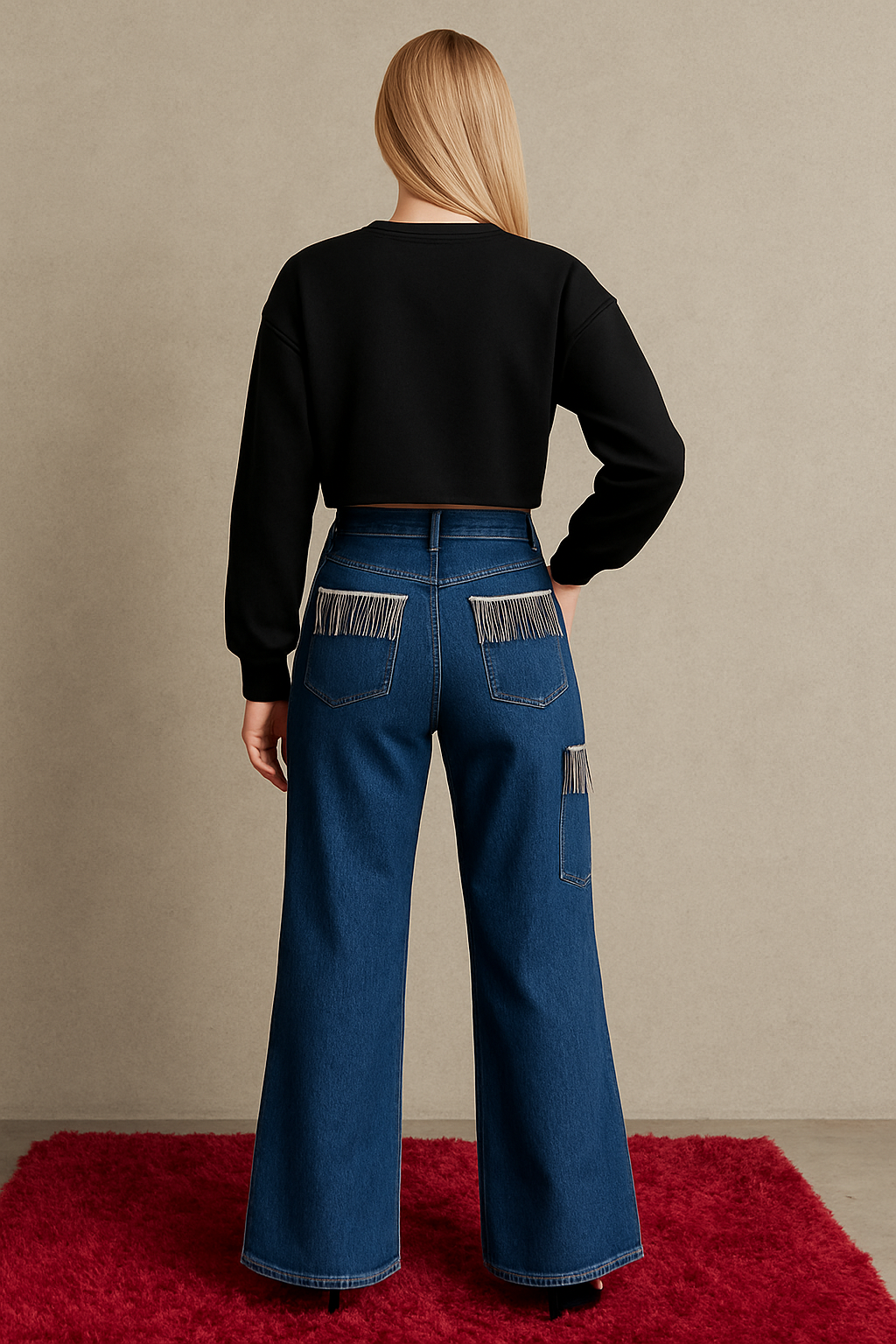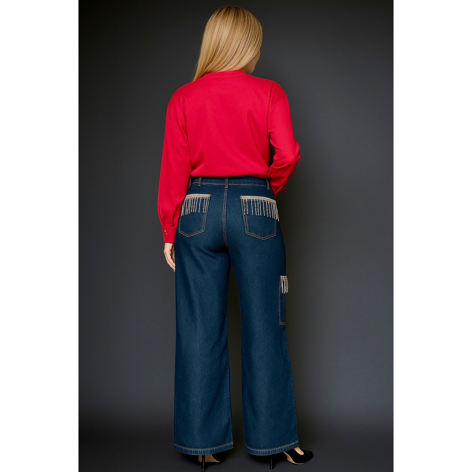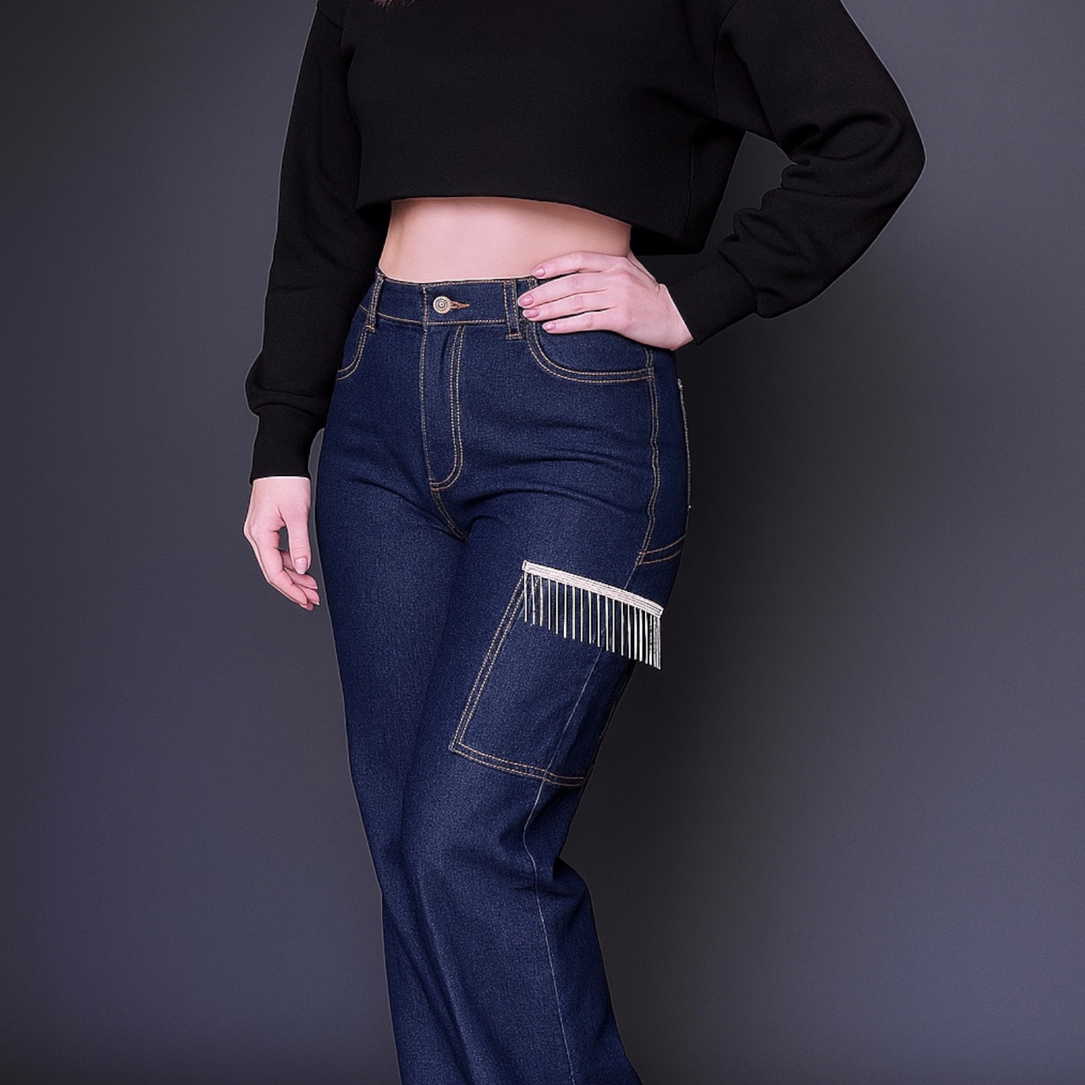 Elevate your style with the Glam Fringe Denim, a pair of wide-leg jeans crafted for both comfort and high fashion. Featuring jewel-fringe detailing on the front pocket, these jeans blend classic denim aesthetics with a chic twist. Perfect for a day out or an evening event, these jeans are your go-to for a bold and refined statement.