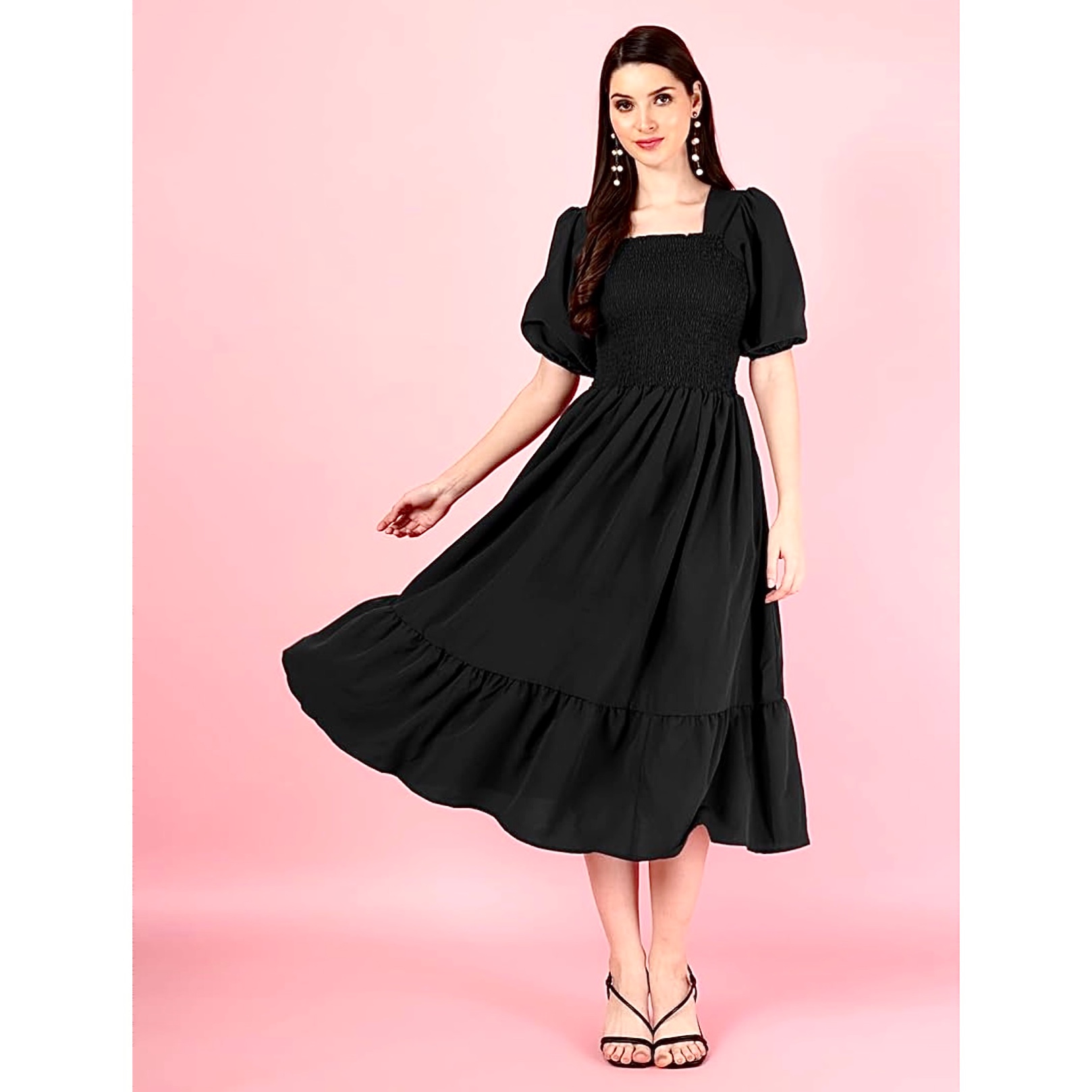 An effortlessly elegant black midi dress featuring a smocked bodice, puff sleeves, and a flowy tiered hem. Perfect for both casual outings and evening soirées.