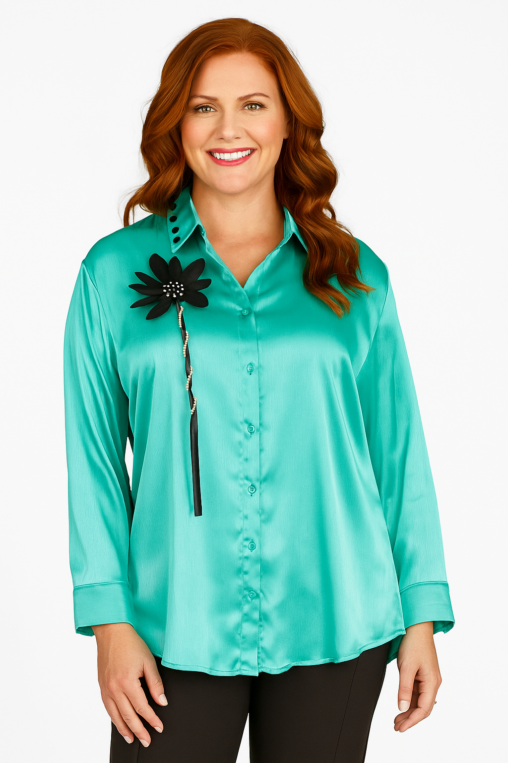 #dressshirt #formalshirt #applique #appliqué #blackstones #ladies #meetingoutfit #outfit #formalwear #greenshirt