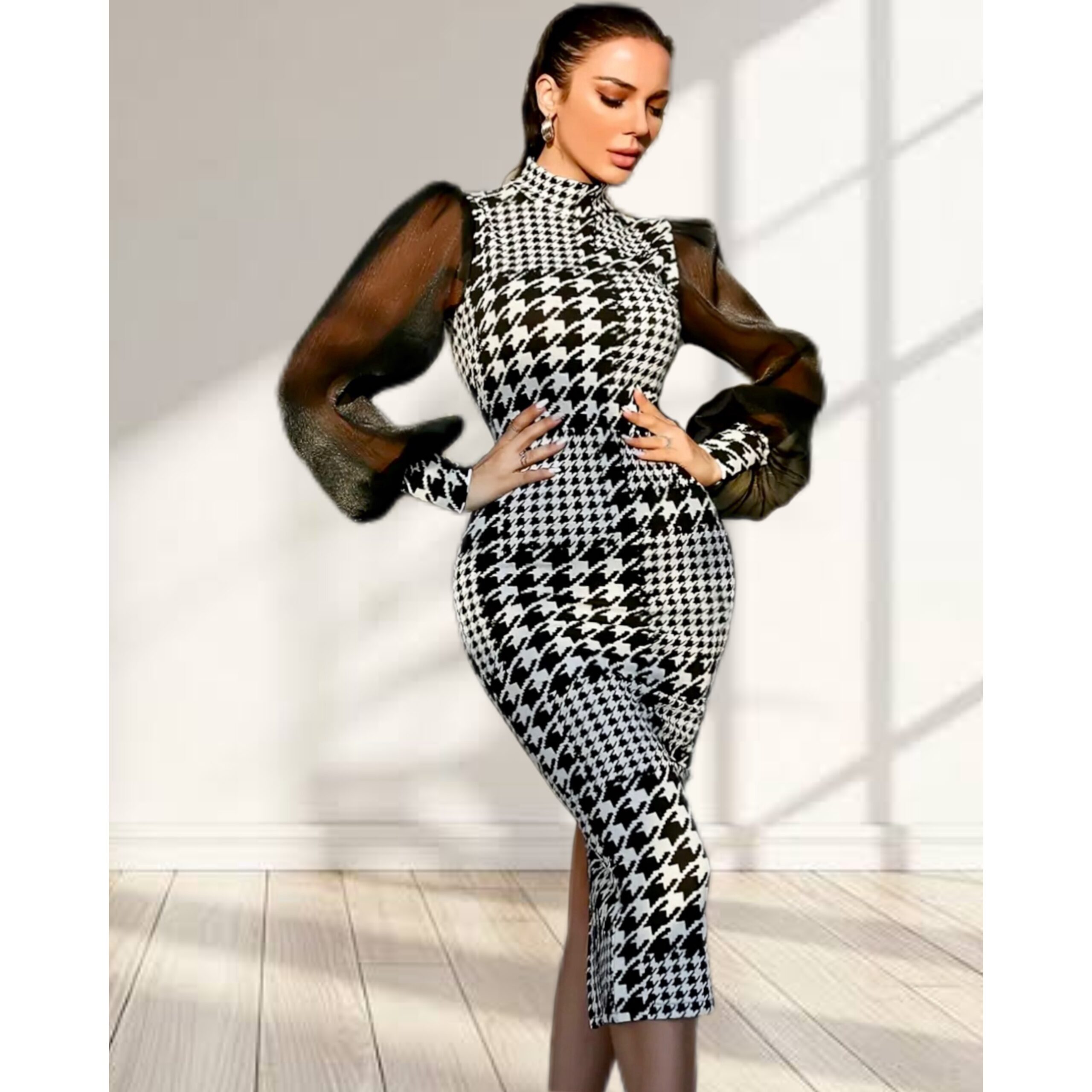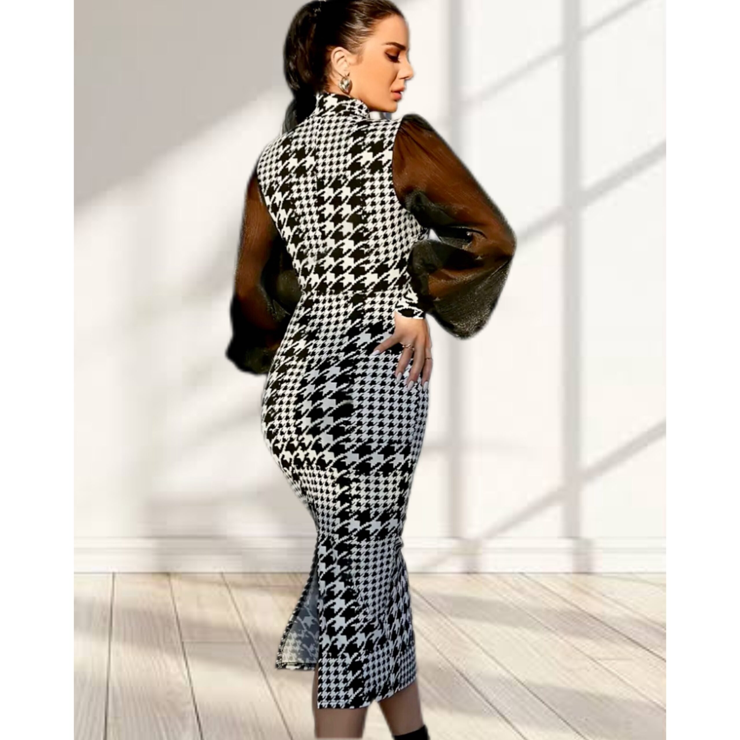 Upgrade your wardrobe with this black and white houndstooth midi dress, featuring sheer puff sleeves for a chic and modern touch. The high neckline and tailored fit offer a sophisticated silhouette, perfect for office wear, formal events, or evening outings.