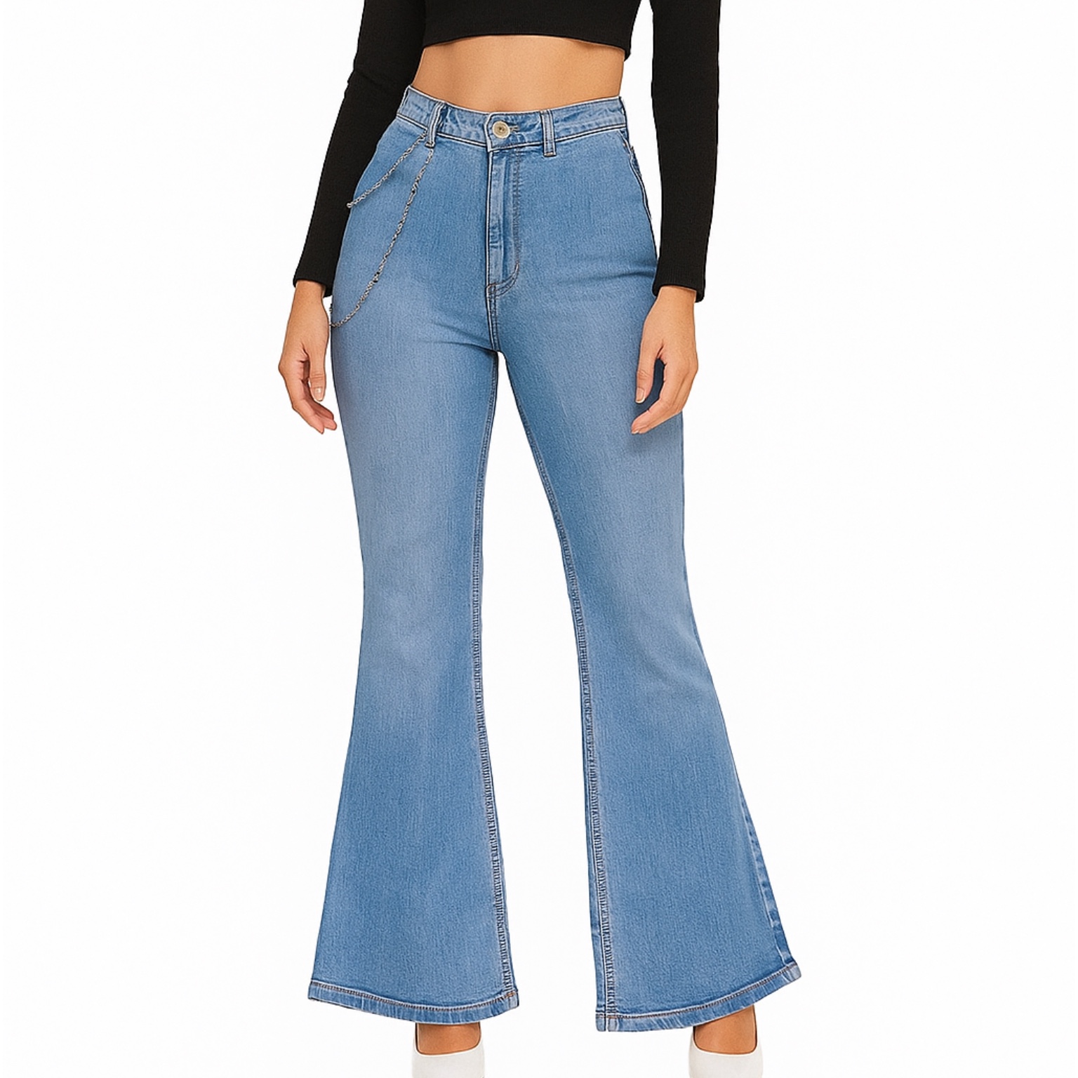 Make a bold fashion statement with these blue flared jeans, featuring a trendy chain detail hanging on the right side. Combining classic flared styling with edgy accents, these jeans are perfect for adding a touch of uniqueness to your wardrobe.