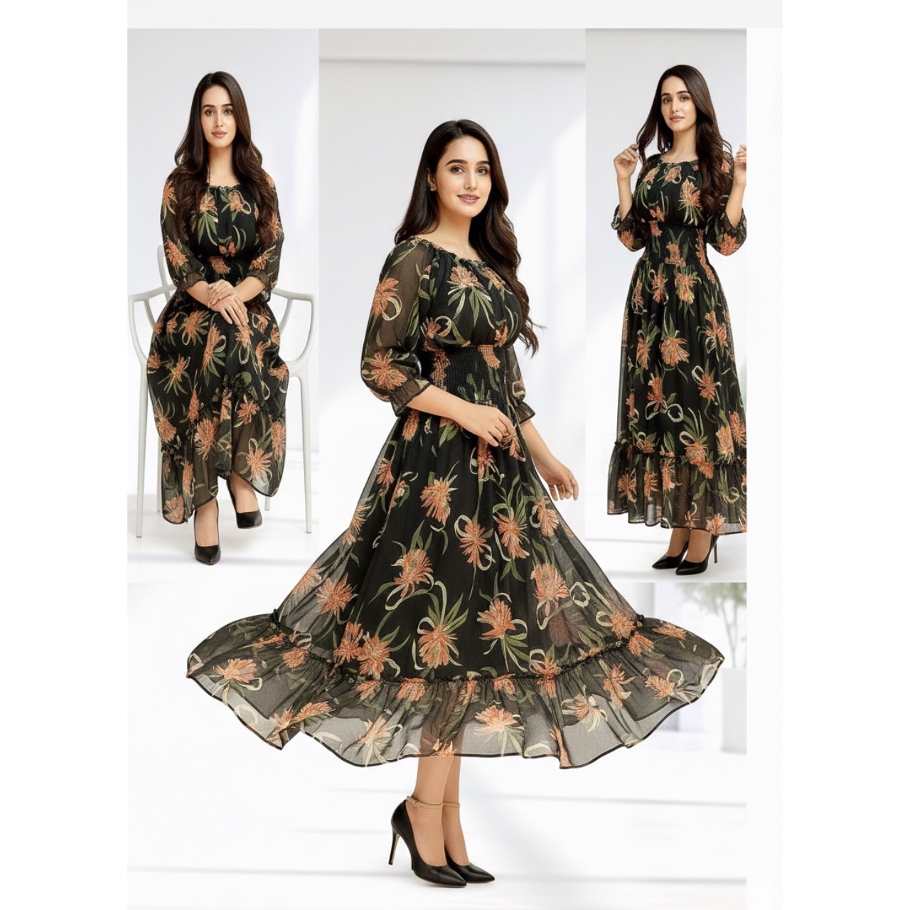 Step into the season with ethereal grace in our Twilight Bloom Maxi. Crafted in a flowy silhouette with sun-kissed floral prints on a sheer black base, this dress blends comfort with charm. The smocked waist and tiered hemline flatter every curve, making it a dreamy choice for brunches, vacations, or golden-hour strolls. Lightweight, breathable, and utterly romantic — it’s summer, wrapped in petals.