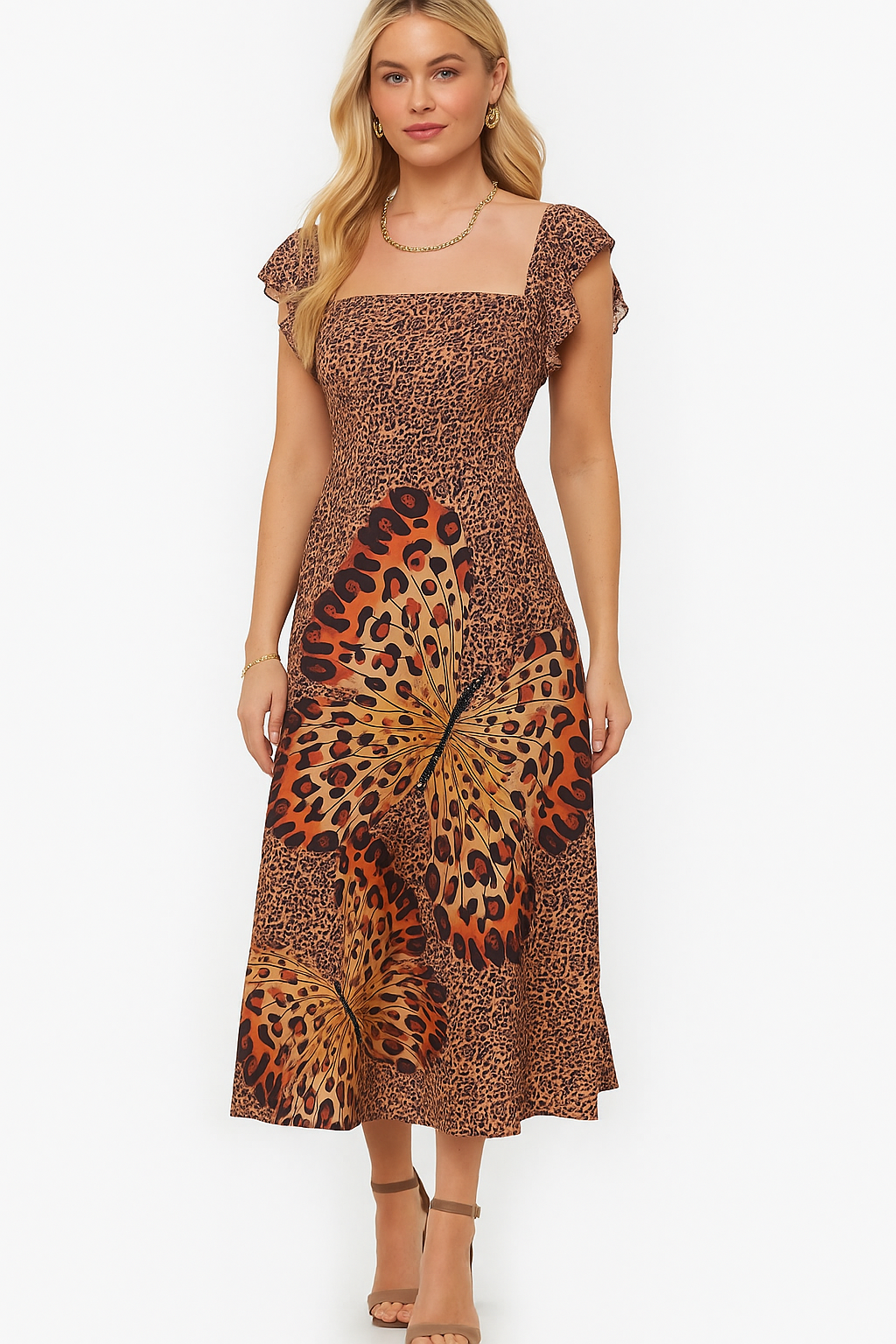 “Off-shoulder dress featuring intricate butterfly embellishments adorned with sparkling stones and sequins, paired with a bold leopard print for a striking, chic look.”